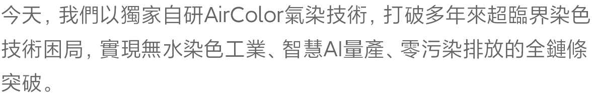 今天,我們以獨家自研 AirColor 氣染技術,打破多年來超臨界染色技術困局,實現無水染色工業、智慧 AI 量產、零污染排放的全鏈條突破。