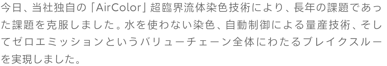 今日、当社独自の「AirColor」超臨界流体染色技術により、長年の課題であっ た課題を克服しました。水を使わない染色、自動制御による量産技術、そし てゼロエミッションというバリューチェーン全体にわたるブレイクスルー を実現しました。